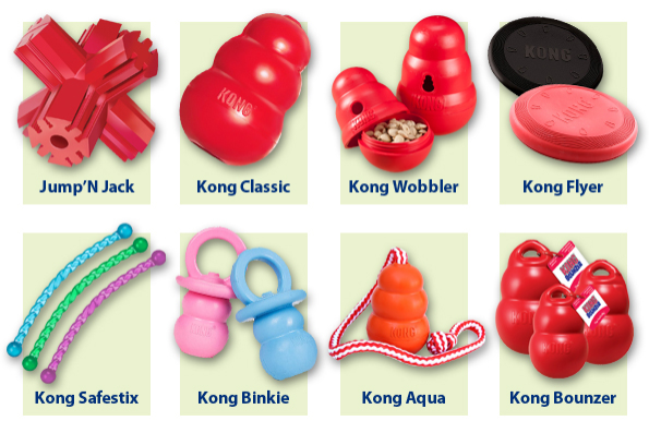 Dazu zählen unter anderem der befüllbare Kong Classic, der Kong Wobbler, der Futterball für intelligente Hunde, der Safestix für gefahrlose Stöckchenspiele sowie den Kong Flyer für verletzungsfreie Frisbeespiele.